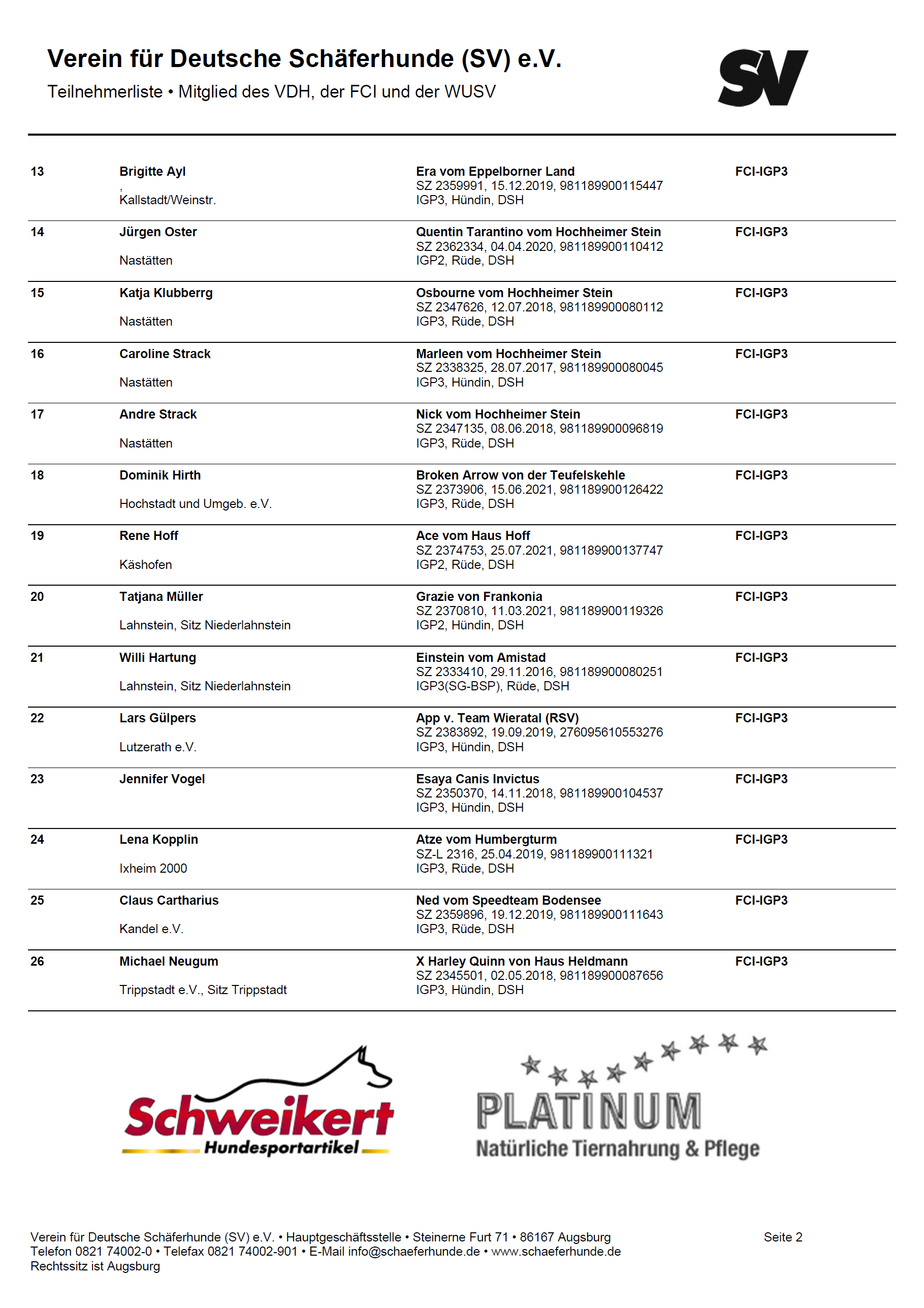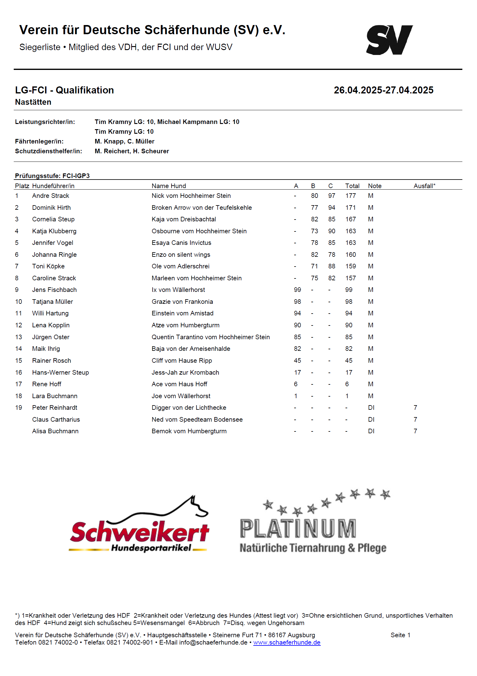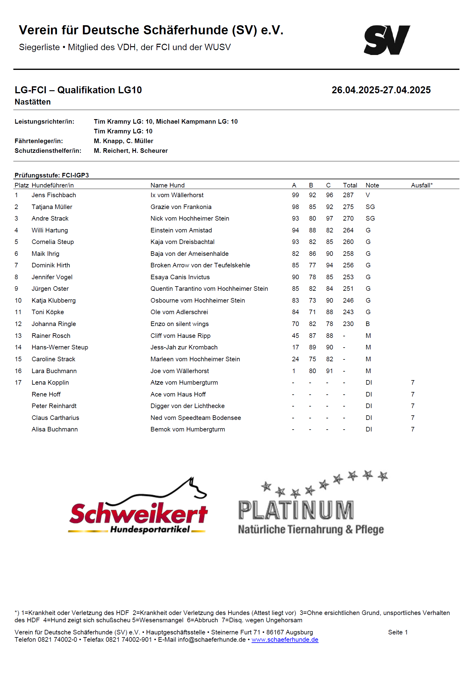 Den amtierenden Leistungsrichtern, Herrn Tim Kramny und Michael Kampmann, den Fährtenlegern und Helfer im Schutzdienst sage ich herzlichen Dank für die Übernahme der Tätigkeiten in den einzelnen Funktionen.